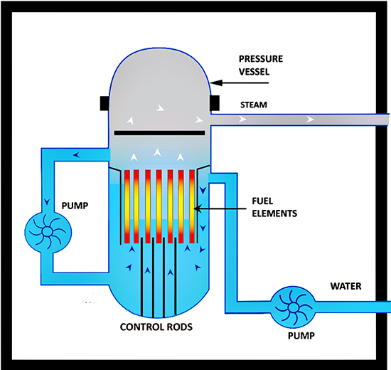 BWR (Boilling Water Reactor) is water cooled and moderate reactor. The BWR construction has many similarities to the PWR. Both are using a light water to cool and moderate reactor and are known as Light Water Reactors (LWRs). But in the BWR water is also a working medium. The BWR is simplifier design of PWR. There is only the single circuit. Water is kept under low pressure, 7 MPa, 2-3 times lower than in PWR, and it can boil directly in the core. Reactor is better cooled but moderating effect and efficiency is decreasing. In the upper part of reactor steam separator and drier are located. Reactor can operate with 12-15% evaporation of water. Steam is produced in the core and passed to turbine. Water around the core is always radioactively contaminated. For that reason biological shield have to contain all devices in reactor circuit so maintenance activity is more difficult. Fortunately, most of the radioactive nuclides are N-16, with half-life period of 7 s. Steam in the core cause decrease in reactor power density by 50% in comparison to PWR, and it is 50 MW/m3. Changing water density cause not equal heating in the vertical axe of core and hence control rods inserted from the bottom of reactor not only regulate level of reactivity but also compensate inequality of power distribution in the core. BWR net efficiency is around of 34 %. It uses enriched fuel in uranium dioxide. An enrichment level is 2,8 % U-235. Lower cost of BWR simpler design is balanced with necessary radiological shields to ensure demanded level of nuclear safety. This type of reactor can follow the load without difficulty and more willingly than PWR. [16],[21],[24],[27]